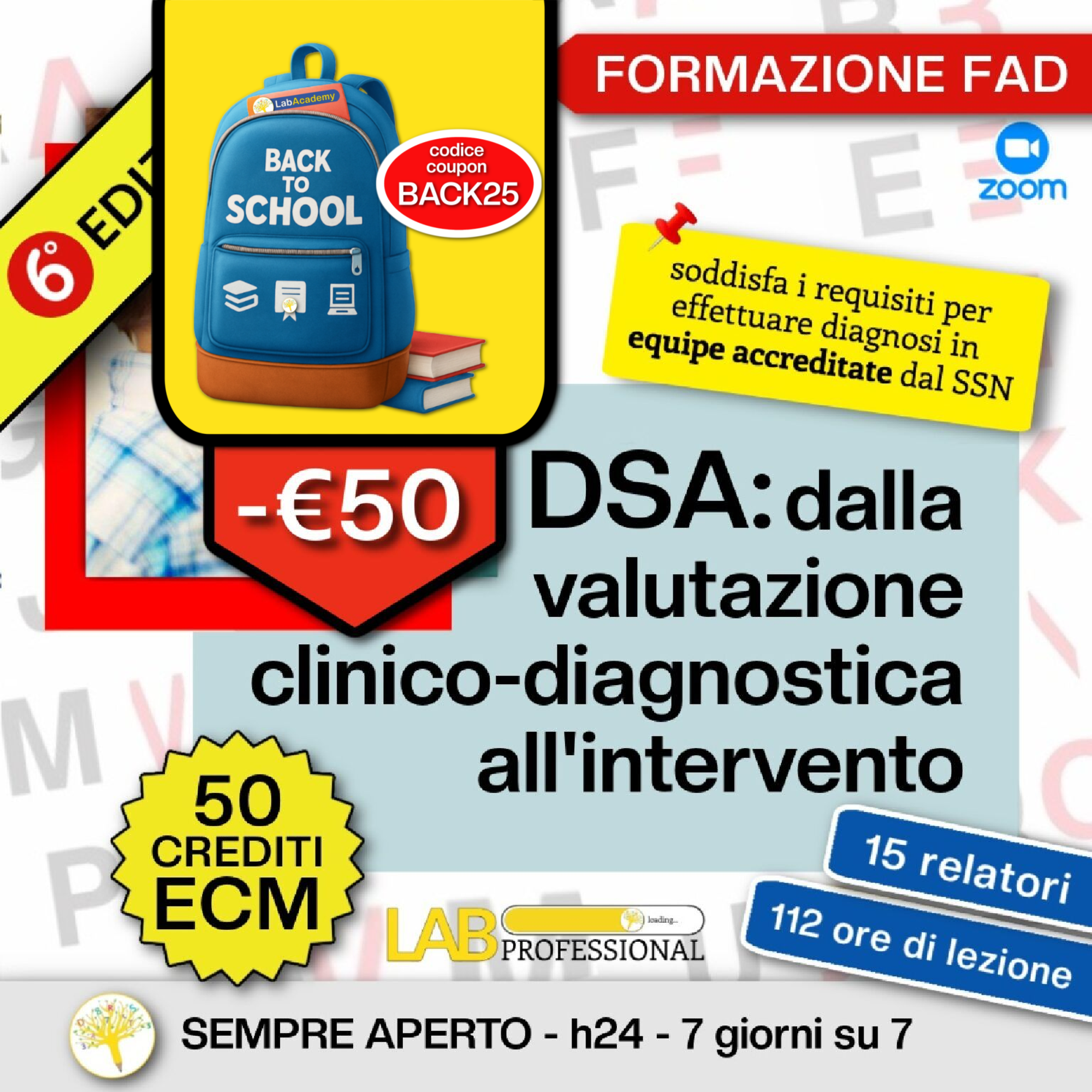 Attestato ECM del Corso Alta formazione DSA: dalla valutazione clinico-diagnostica all’intervento – 6° edizione valido per presentare domanda di iscrizione nelle equipe multidisciplinari private regionali (es. Delibera 32/2020 del Lazio e affini presenti nella altre regioni italiane)